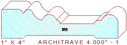 This extravagant architrave/header 4" - 1 measures 4.000" wide by one-inch thickness, permitting the use of five-quarter lumber for milling on industrial equipment. The ornate profile is composed of a 3/4" broad line segment with a 1/16" eased outer and a 3/16" rounded inner edge on the top left, attached to a short two tangent radius cyma reversa merged with a 31/64" wide half-round and 9/64" quarter round bead in the center, connected to a 1-9/64" wide sunk fillet joined to a 17/64" rounded edge and a 9/16" wide half-circle on the right side of the design.