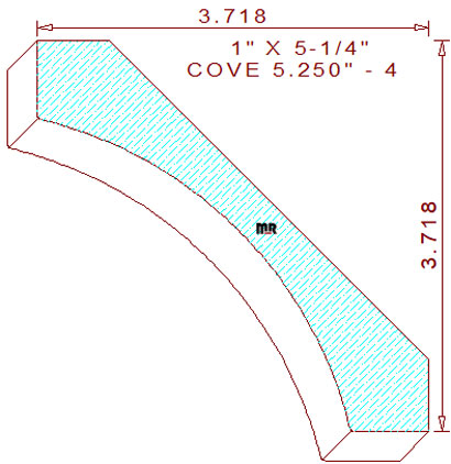 This hefty 5-1/4" - 4 cove mould measures 5.258" wide by 1.000" thick, requiring a 5-1/2" wide blank of five-quarter lumber for milling, sprung (lying horizontally flat) on an industrial moulder. The symmetrical terminating profile features a four-inch-radius cavetto in the center. The middle attaches to a 3/4" tall vertical line at the top left and a 3/4" broad line at the bottom right of the pattern. The spring angles are at 45 degrees ; the dedicated back bevels keep the face sides of the pattern parallel to the wall and ceiling. These specific angle positions lock in the installed height at 3-23/32" tall with a 3-23/32" projection across the top.