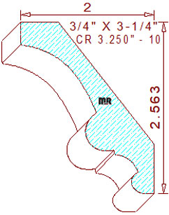This lovely 3-1/4 - 10 crown mould measures 3.250" wide by .750" thickness. The detail will require four-quarter lumber for milling. The elegant profile is comprised of a two tangent radius cove in the center, attached to a 23/64" tall vertical line at the top. The lower portion of the design consists of a 5/8" wide half-round circle connected to a small vertical fillet, joined to a 3/8" radius cove with a 7/32" radius half circle at the bottom of the pattern. The spring angles are fixed at thirty-eight and fifty-two degrees, these specific back bevels set the installed height at 2-9/16" tall, with a projection of 2" across the top.