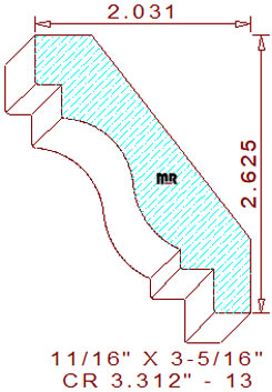 This stunning 3-5/16" - 13 crown mould measures 3.319" width by .687" thickness, requiring a 3-9/16" wide blank of four-quarter lumber for milling sprung (laying horizontally flat) on a commercial moulder. The attractive terminating profile comprises a 15/32" tall line segment joined to a 5/16" tall by 1/4" wide notch on the top left. The cut-out connects to a 1-1/16" concave semicircle tangent off a 3/4" convex arc, creating the free-flowing cyma recta with a 3/16" high line in the center. The short line joins another perpendicular notch with an 11/32" broad line on the design's bottom right corner. The fixed spring angles are set at thirty-eight and fifty-two degrees; these particular back bevels keep the face side of the profile parallel to the wall and ceiling when installed, in addition to locking in the height at 2-5/8" tall with a 2-1/32" projection across the top.